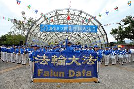 Les pratiquants de Taipei tiennent des banderoles pour clarifier les faits sur le Falun Gong au Parc de la résidence Shilin CKS, et aux touristes qui passaient, ils ont crié « Falun Dafa est bon »