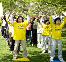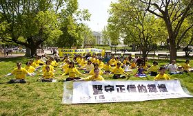 La pratique en groupe sur la place Lafayette, près de la Maison Blanche, fait partie de la commémoration locale du 12ème anniversaire de l’appel pacifique à Pékin du 25 avril 1999.