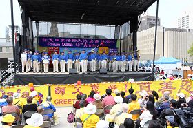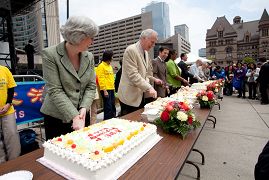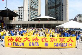 Le 13 mai 2011, la Journée mondiale de Falun Dafa et l’anniversaire du Maître Li, les pratiquants de Falun Gong et les partisans se sont rassemblés sur la place Nathan Phillips à Toronto pour un rassemblement et pour célébrer. Un membre du parlement provincial et des membres du conseil municipal de Toronto ont participé à l’événement et a recommandé Falun Dafa.