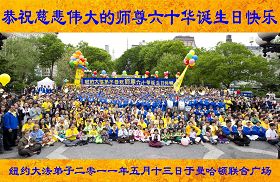Des pratiquants du Falun Dafa de New York souhaitent respectueusement un Joyeux Anniversaire au Vénérable Maître et célèbrent la Journée mondiale du Falun Dafa!