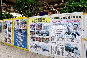 Depuis onze ans, les pratiquants de Falun Gong ont installé des kiosques, à des emplacements très fréquentés, dans l'ensemble de Hong Kong, où ils distribuent de la littérature et montrent des photos, des affiches et des banderoles. Ils ont également des tables avec des personnes qui encouragent les touristes chinois qui s’approchent à démissionner du Parti communiste chinois (PCC). Ces lieux de rendez-vous du Falun Gong attirent souvent beaucoup d’intérêt des groupes d'excursion des Chinois du continent. Ils sont reconnus pour irriter les fonctionnaires du PCC.