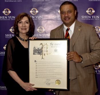 Avec une proclamation officielle en main, Eric A. Stevenson, membre de l’Assemblée de l’État de New York est venu féliciter Shen Yun Performing Arts pour leur présentation unique de la danse classique chinoise, suite à la représentation de la compagnie vendredi soir au Centre Lincoln.