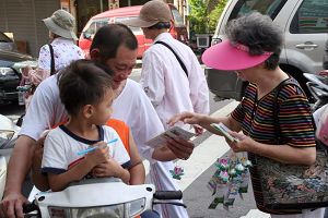 Un pratiquant présente le Falun Gong à un père et à son fils sur un scooter