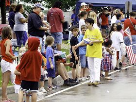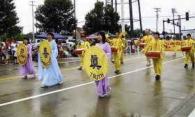 Les pratiquants participent au défilé du Jour de l'Indépendance à O'Fallon depuis sept ans et ils ont été chaleureusement accueillis par les personnes de la localités pour leur sujet traditionnel. Beaucoup de personnes ont applaudi dès qu'ils ont vu le contingent de Falun Gong dans le cortège. Certains se sont balancé sur le rythme des battements des tambours Tang. Un garçon a pointé une banderole du «Falun Dafa» et il a crié: «Falun Dafa est formidable!» Certains ont suivi les pratiquants qui ont présenté les exercices sur le char. Beaucoup de personnes ont demandé aux pratiquants distribuant des dépliants le long de l'itinéraire du défilé, ce qu’était le Falun Gong. Dès que le défilé a pris fin, quelqu'un a appelé le numéro de contact sur le dépliant, en disant qu'il voulait apprendre les exercices de Falun Gong.
