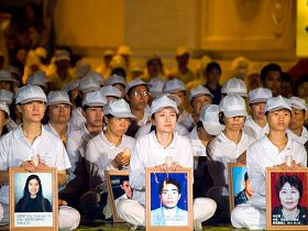 Les pratiquants se sont assis devant les portraits de pratiquants qui ont été torturés à mort en Chine par le parti communiste chinois (PCC). Depuis 12 ans, les pratiquants de Falun Gong en Chine font face à la persécution brutale du PCC.