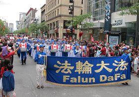 Le défilé annuel de la Fête nationale du Canada est une activité à grande échelle qui est volontairement lancée et organisée par des personnes de toutes les conditions sociales à Montréal. Les pratiquants du Falun Gong participent à ce défilé depuis l'an 2000. Leur char est admirablement décoré, les danses élégantes des «fées célestes» et les démonstrations d'exercice ont laissé une impression favorable sur les organisateurs et les touristes. Le groupe de Falun Gong est graduellement devenu une partie importante du défilé. Depuis que la Fanfare Terre divine canadienne a été établie en 2006, elle a été invitée à participer au défilé de la Fête nationale du Canada à Montréal depuis six années consécutives. La fanfare a été également fortement félicitée et récompensée pour ses merveilleuses performances.