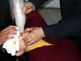 3. Gavage de force avec de l'eau tout en ayant le nez couvert. Des fois, la police combinait cette torture avec une autre. Une fois j'étais dans une telle agonie que j'ai lutté avec mes jambes et je suis tombée du banc.