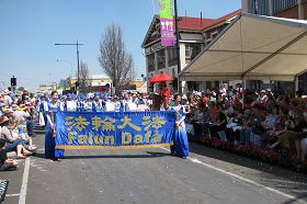 Le défilé a débuté à midi et s’est déroulé le long de la rue Herries sur plusieurs milles. Plus de 100 mille personnes étaient alignées dans les rues pour le regarder. Le cortège du Falun Gong se composait de la Fanfare Terre divine, d’une présentation des exercices, des danseurs de dragon, des fées célestes, et d’un groupe de tambourins à ceinture. Les pratiquants tenaient de grandes banderoles où on pouvait lire «Falun Dafa est bon» et «Le monde a besoin de Authenticité –Compassion – Tolérance.» La Fanfare Terre divine a interprété plusieurs airs composés par des pratiquants de Falun Gong. Leurs prestations ont été grandement appréciées par les spectateurs. Beaucoup de Chinois saluaient fièrement la fanfare.