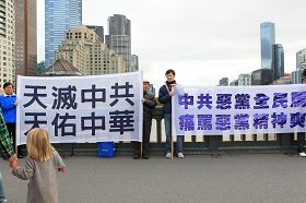 Chris Ryan est passé par là et il a vu les banderoles. Il a parlé avec le journaliste en disant: «J'ai appris à connaître la persécution faite au Falun Gong en Chine. À mon avis toute personne devrait avoir la liberté de parole et de croyance. Falun Gong ne devrait pas être persécuté par le régime dictatorial du PCC. Je me demande pour quelle raison le PCC estime que le Falun Gong constitue une menace. C'est étrange parce que tout ce qu'ils font, c'est méditer et améliorer leur santé. Je suis contre le régime totalitaire et j'espère que le peuple chinois aura bientôt la joie de vivre démocratiquement et librement».
