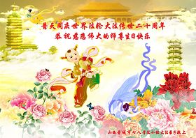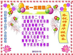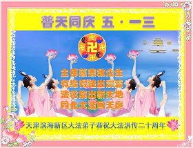 L`équipe de promotion de NTDTV de Tianjin souhaite respectueusement au grand Maître compatissant un bon anniversaire et célèbre le 20ème anniversaire de la présentation du Falun Dafa au public !