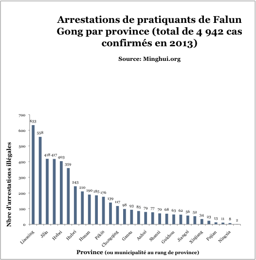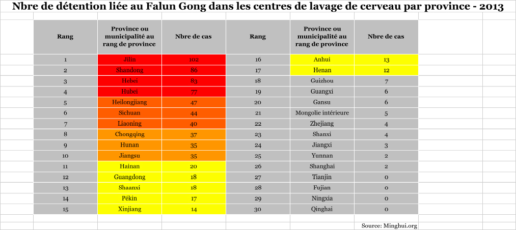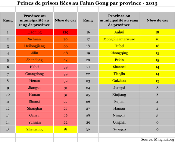 En se basant sur les données fournies, la persécution du Falun Gong est plus grave dans ces provinces : Liaoning, Shandong, Heilongjiang, Jilin, Hebei et Sichuan, suivi des provinces du Henan, du Jiangsu, du Hunan, du Hubei et du Guangdong.