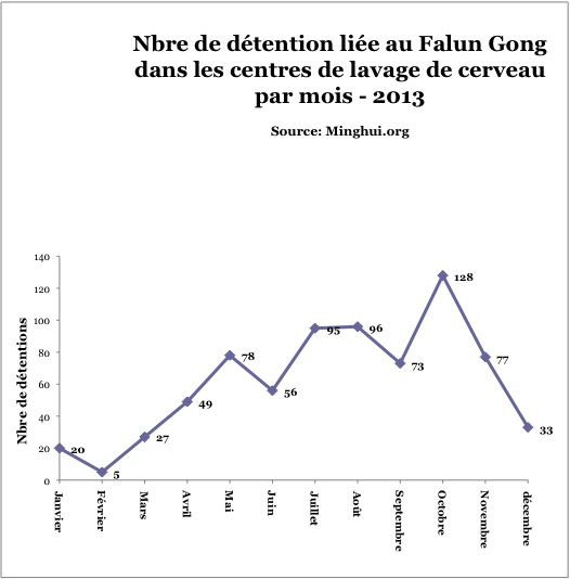 Le kidnapping de pratiquants de Falun Gong par des policiers, des autorités ou des agents secrets se sont produits tous les jours en Chine. En 2013, au moins 4 942 pratiquants ont été kidnappés (Figure 6). La répartition mensuelle est présentée à la figure 6.