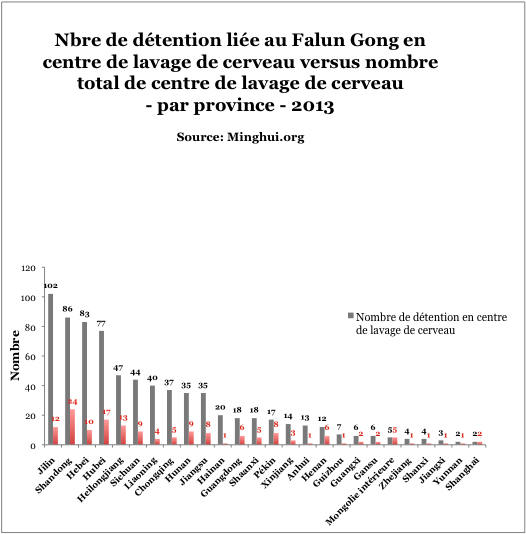 Parmi les pratiquants kidnappés en 2013, 633 venaient de la province du Liaoning, 558 du Shandong ; 418 du Jilin ; 417 du Heilongjiang ; 403 du Hebei ; 359 du Sichuan et 243 du Hubei. À partir des données ci-dessus, nous pouvons constater que 27 pratiquants ont été kidnappés en Chine tous les deux jours.