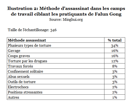 En décembre 2013, Minghui a publié un rapport sur la torture et les meurtres des pratiquants de Falun Gong par le PCC. Ce rapport identifie 546 cas de décès comme une conséquence directe de la torture et le meurtre dans des camps de travail sur un total de 2383 cas de décès résultant de l'emprisonnement.