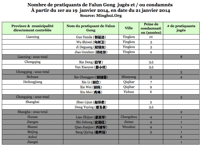 En 2014, 33 pratiquants de 11 régions ont été « jugés » pour différents crimes faussement présumés. Les 33 pratiquants n'étaient coupables de rien d'autre que d'être restés fermes dans leur croyance choisie et d'avoir le courage de parler publiquement de la persécution du Falun Gong. 16 d'entre eux ont été condamnés à la prison. Voir le tableau ci-dessous.