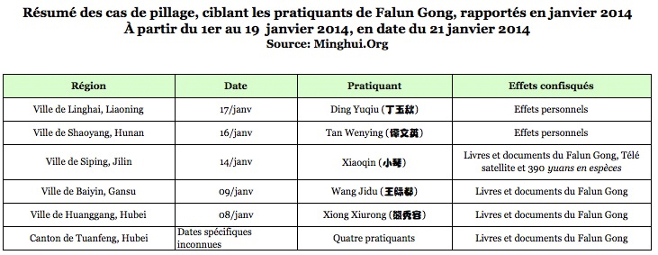 Dans les 19 premiers jours de 2014, 228 pratiquants de 22 régions ont été arrêtés et leurs maisons fouillées : 41 dans le Liaoning, 39 dans le Shandong, 24 dans le Heilongjiang, 24 à Chongqing, 15 dans le Sichuan, 14 dans le Hunan, 11 à Pékin, 8 dans le Hubei, 7 dans le Jiangsu, 6 dans le Hebei, 6 en Mongolie intérieure, 5 dans le Jiangxi, 4 dans le Henan, 4 dans le Jilin, 4 dans le Shaanxi, 3 dans le Guangdong, 3 dans le Zhejiang, 3 dans le Gansu, 2 dans la province du Guizhou, 2 à Shanghai, 2 dans le Ningxia, et 1 à Tianjin.