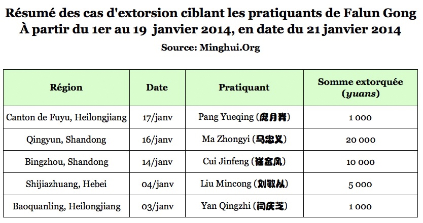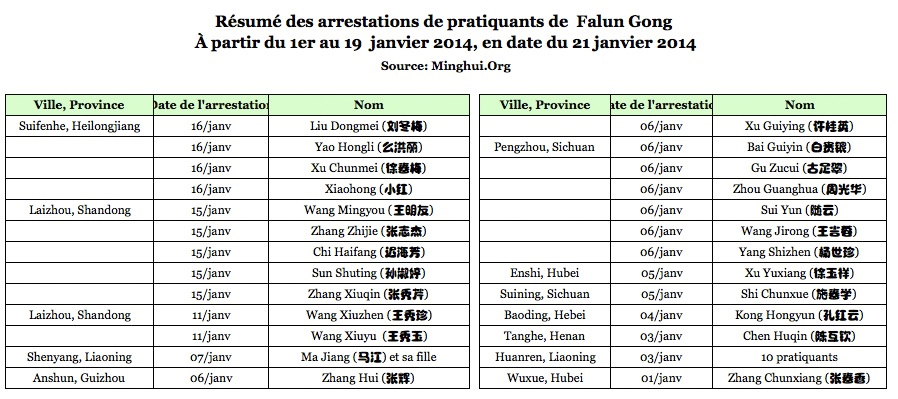 (Minghui.org) À l'approche des fêtes du Nouvel An, de nombreux pratiquants de Falun Gong ont été arrêtés ou forcés à quitter leur domicile au cours de cette période. En date du 21 janvier, Minghui a reçu des rapports de 228 arrestations en janvier, 33 « procès » résultant en 16 peines illégales d'emprisonnement et 16 détentions dans des centres de lavage de cerveau. À ce jour, en janvier, 3 cas de décès ont été signalés (dont deux ont en fait eu lieu dans les derniers jours de 2013).