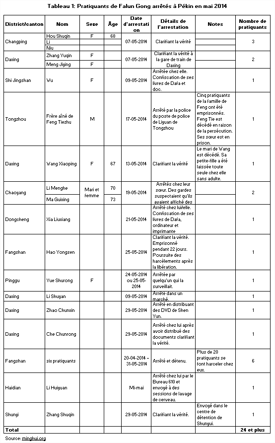 (Minghui.org) Selon les mises à jour de la persécution publiées sur le site Minghui, plus de 60 pratiquants de Falun Gong ont été illégalement arrêtés à Pékin, en mai et juin 2014, soit trois fois le nombre d'arrestations qui ont eu lieu en janvier et février et 50 % de plus qu'en mars et avril. La plupart des pratiquants arrêtés ont été placés dans des centres de lavage de cerveau. Le Bureau 610 et la police ont continué de harceler les pratiquants de Falun Gong, à leur domicile.