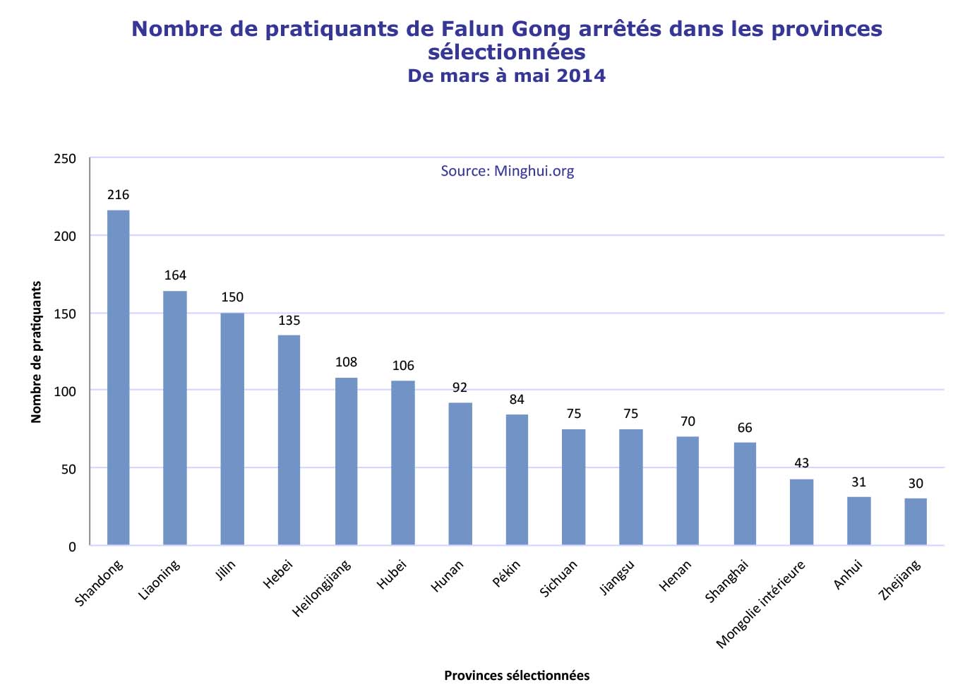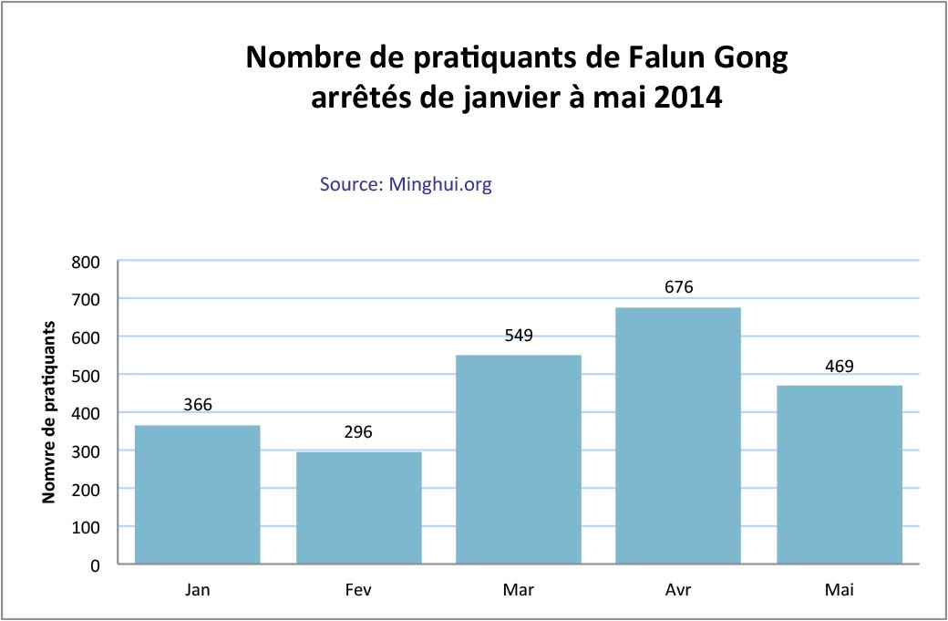 Ces événements ont été documentés dans toutes les provinces, municipalités et régions autonomes de la Chine, à l'exception du Tibet. Le nombre de pratiquants de Falun Gong arrêtés a grimpé en flèche depuis mars. Selon les informations reçues à partir du 3 juin, 1 694 pratiquants ont été arrêtés de mars à mai en 2014, une augmentation de 30% par rapport à la même période en 2013.