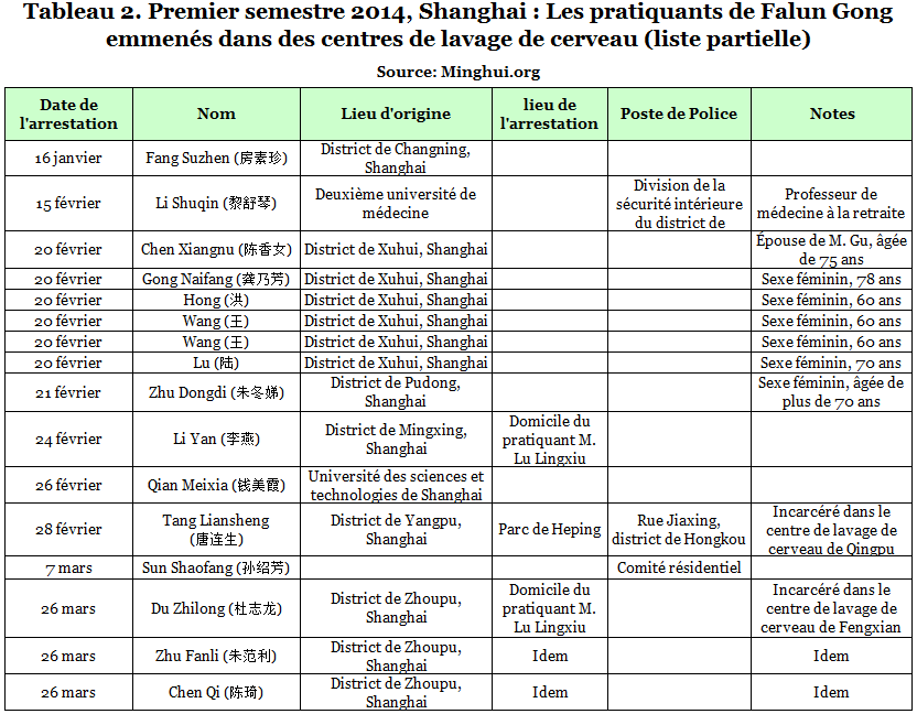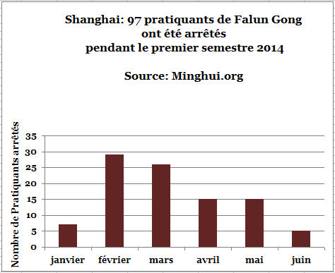Selon des articles incomplets publiés sur le site Minghui, pendant le premier semestre 2014, 97 pratiquants ont été illégalement arrêtés, 4 pratiquants ont été condamnés à au moins trois de prison et 17 pratiquants ont été emmenés dans des centres de lavage de cerveau.