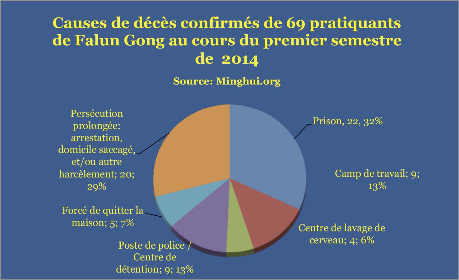 (Minghui.org) Soixante-neuf nouveaux cas de décès de pratiquants de Falun Gong ont été confirmés au cours du premier semestre de 2014. Parmi eux, 49 décès sont survenus en 2014. 20 pratiquants sont morts en 2013 ou plus tôt, mais ces cas ont été confirmés en date du 28 juin 2014.
