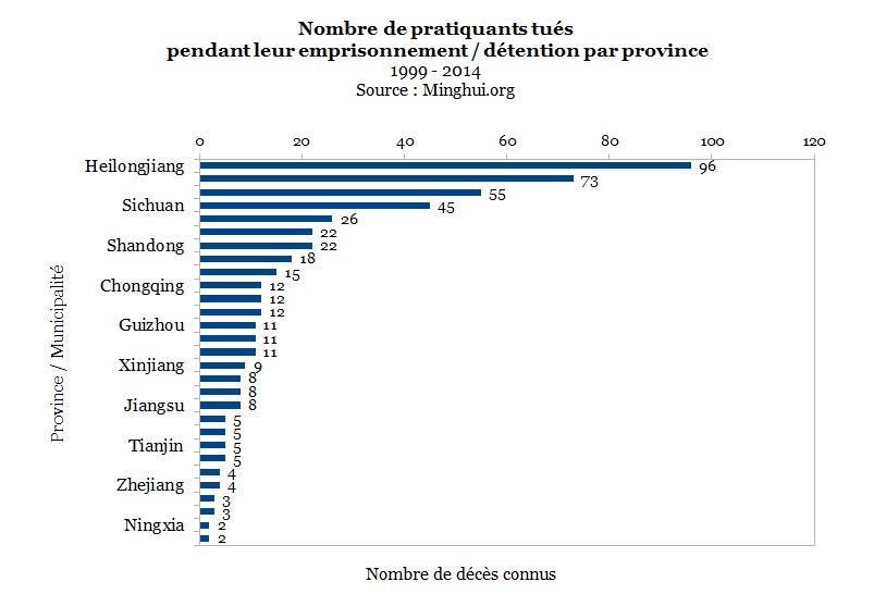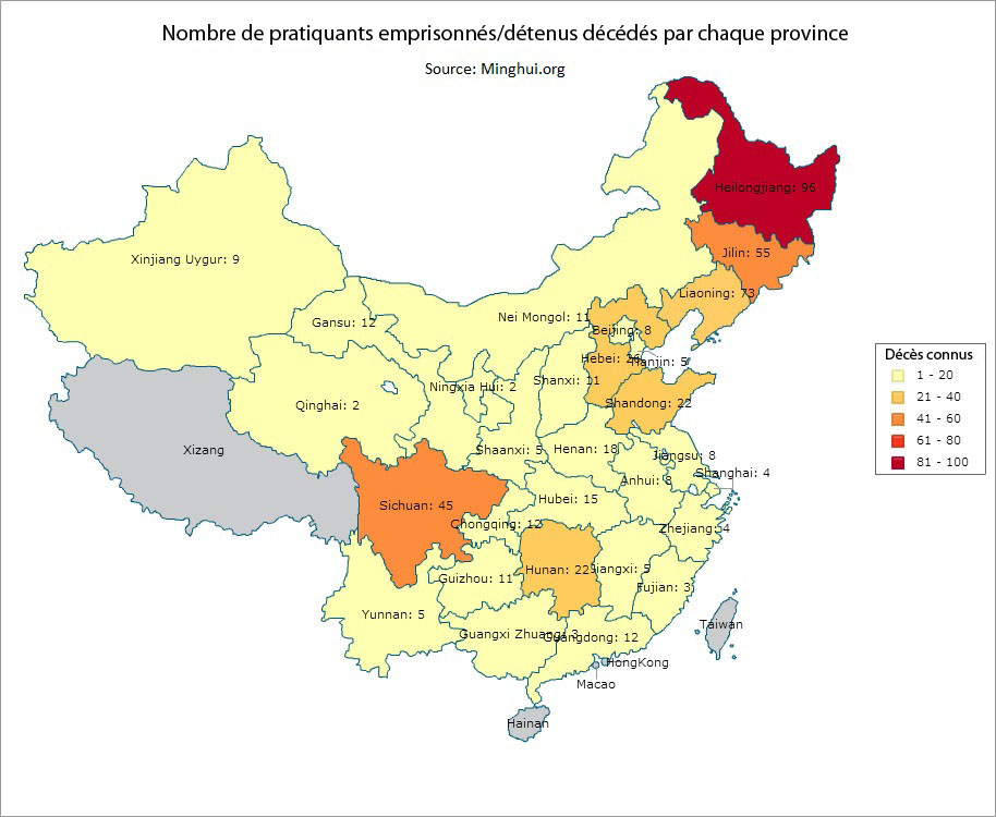 Ces décès ont été signalés dans toutes les provinces et municipalités chinoises, à l'exception de la province du Hainan et la région autonome du Tibet. Parmi les 512 cas enregistrés, il y a 427 décès de pratiquants en prison, 51 dans les centres de détention, 1 dans un camp de travail, et 33 inconnus. En raison de la censure sous le régime chinois, les chiffres ci-dessus ne représentent probablement qu'une petite fraction du nombre réel.