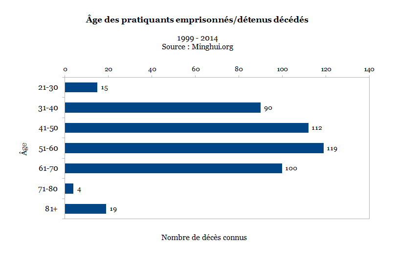 (Minghui.org) Le Parti communiste chinois a lancé sa répression du Falun Gong à l'échelle nationale, le 20 juillet 1999. Le site Minghui a rapporté la mort de 3 714 pratiquants en raison de la persécution le 30 juin 2014. Parmi eux, la mort de 512 pratiquants (14%) a été attribuée directement aux abus qu'ils ont subis pendant leur incarcération dans les prisons, les centres de détention et les camps de travail.