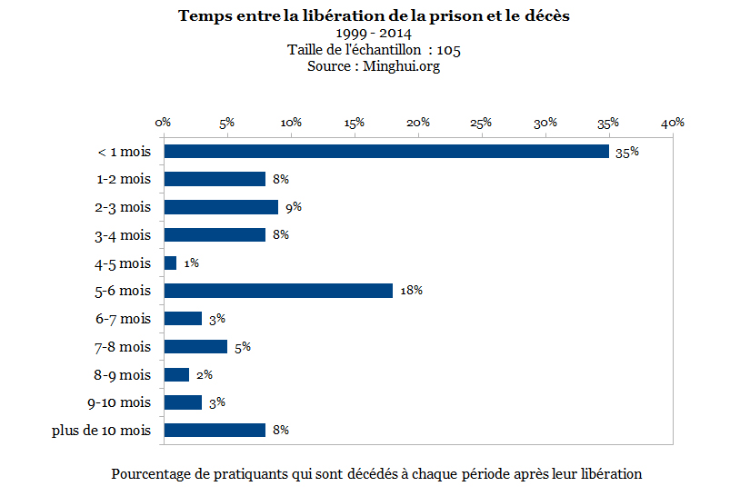 Une analyse de 105 pratiquants pour qui le moment exact de leur libération et de leur mort était disponible montre que 37 pratiquants (35%) sont décédés en moins d’un mois après leur libération, 30% sont décédés dans les 3 jours suivants leur libération et 80% sont décédés dans moins de six mois après leur libération.
