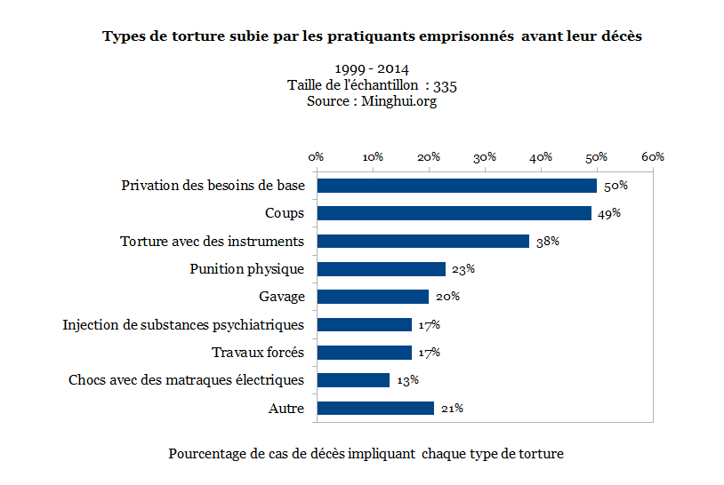 Il y avait 335 cas de décès qui ont été notifiés avec mentions explicites de torture. En moyenne, chaque pratiquant a été soumis à trois types de torture.