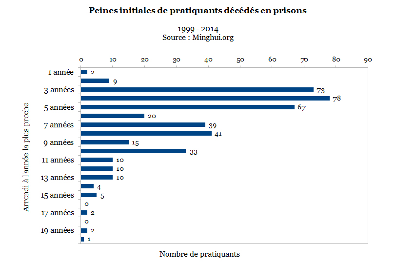 Le site Minghui a rapporté 421 cas de mort avec des peines d’emprisonnement connues, qui s'élèvent en moyenne à 6 ans et 3 mois. Sur l'extrémité de l'échelle, Mme Zhang Li, une pratiquante de la province du Liaoning, a été condamnée à la prison à vie avant d’être torturée à mort.