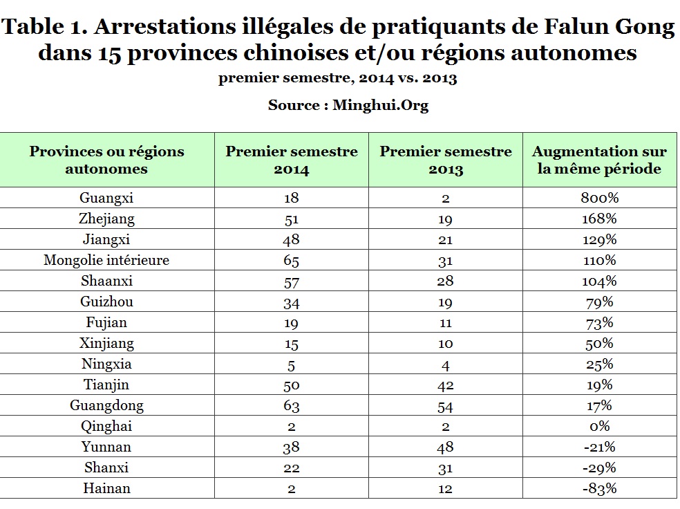Le 1er tableau montre le nombre d'arrestations de pratiquants de Falun Gong dans les 15 principales provinces et municipalités dans le premier semestre de 2013 et 2014. Le nombre augmente dans la plupart des régions, à l'exception du Heilongjiang et du Sichuan, avec une augmentation moyenne de 85,5% et un maximum de 282% (à Shanghai).