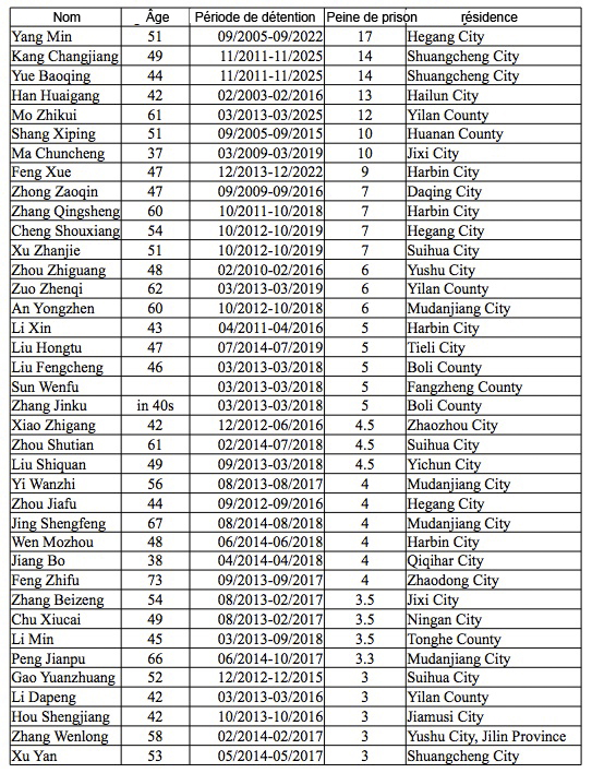 Ce qui suit est une liste de pratiquants emprisonnés, avec leurs noms, leur âge, la durée de leur détention, les termes de leur incarcération et leur lieu de résidence avant leur arrestation.