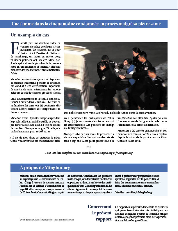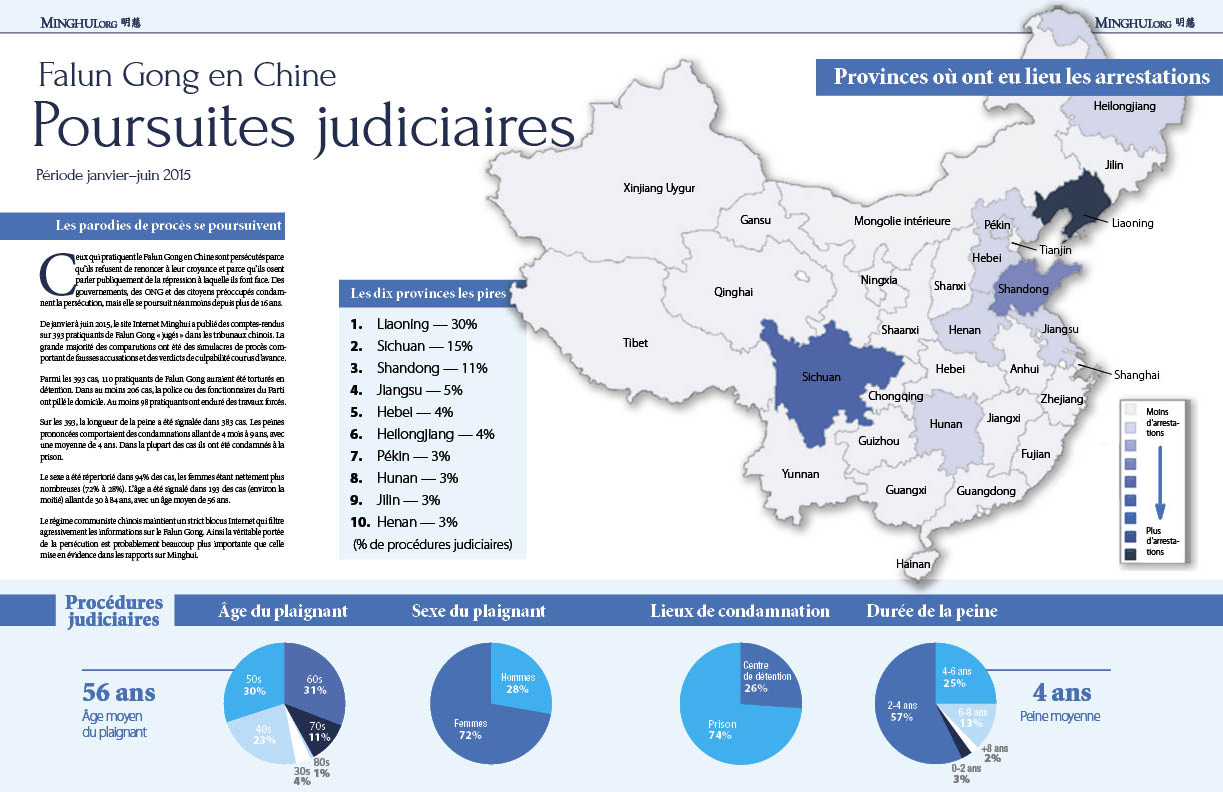 De janvier à juin 2015, le site Internet Minghui a publié des comptes-rendus sur 393 pratiquants de Falun Gong « jugés » dans les tribunaux chinois. La grande majorité des comparutions ont été des simulacres de procès comportant de fausses accusations et des verdicts de culpabilité courus d'avance.