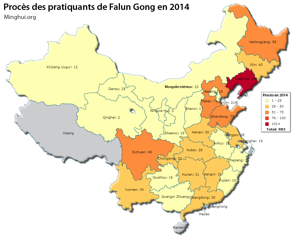 Vingt des trente provinces et régions autonomes de la Chine ont connu une augmentation des condamnations des pratiquants en 2014. La province du Liaoning a eu le plus grand nombre de pratiquants condamnés à la fois en 2013 et en 2014. Les 196 pratiquants condamnés en 2014 dans la province du Liaoning représentent 19,9% de tous les pratiquants condamnés cette année-là, et est d'environ 2,7 fois le deuxième plus grand nombre de 73 dans la province du Shandong.