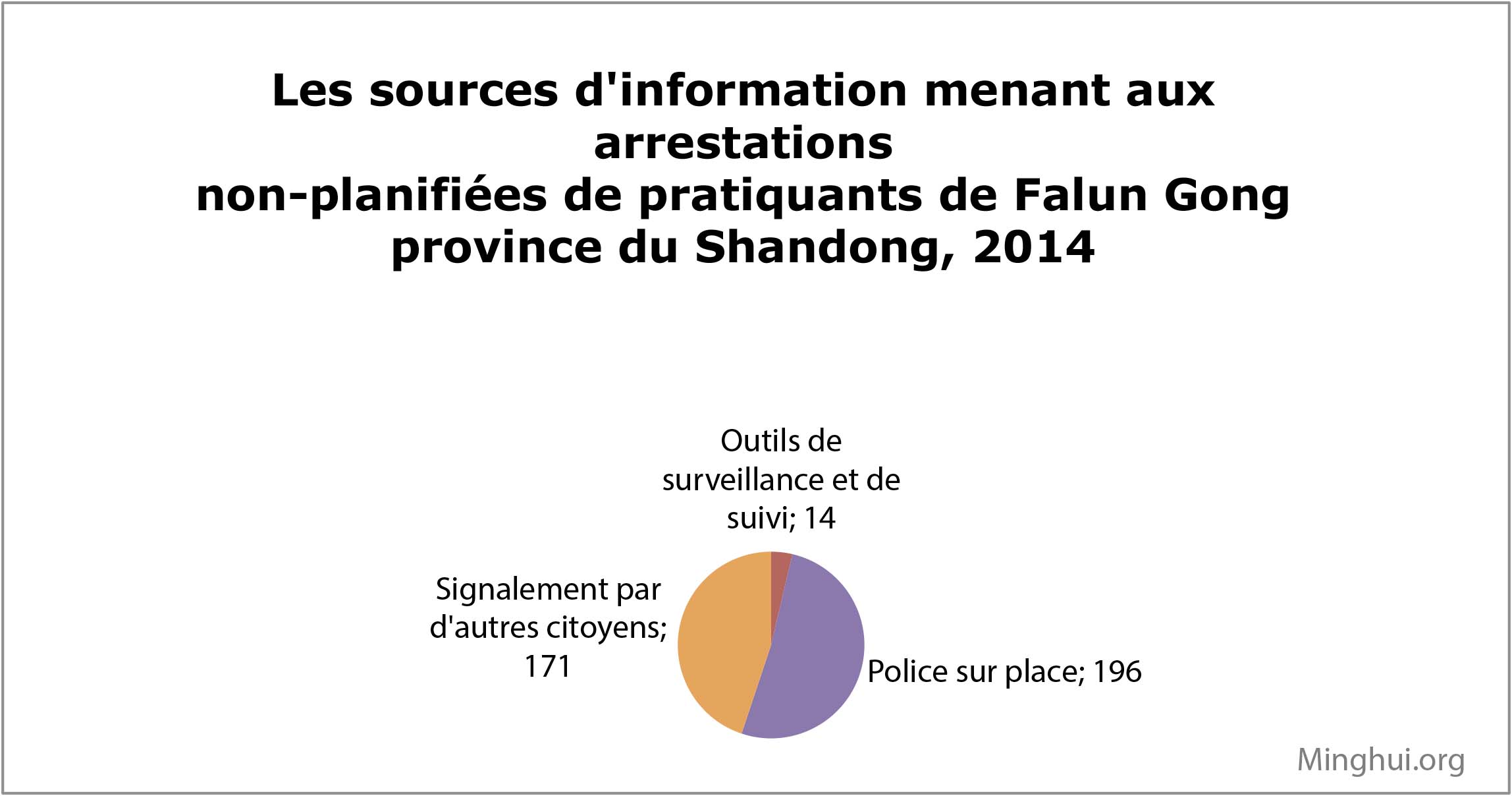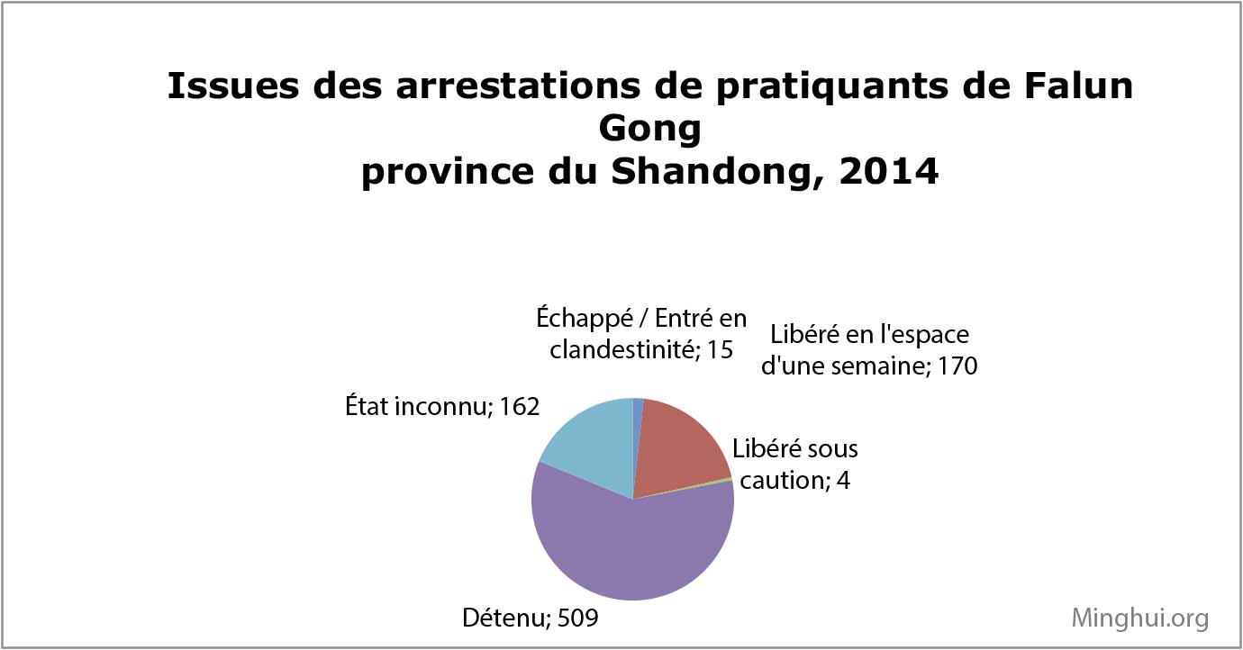Dans le Shandong, la police a fait au total 860 tentatives d'arrestation de pratiquants de Falun Gong en 2014. Sauf pour les 15 personnes qui ont échappé aux arrestations, les 845 pratiquants restants ont tous été placés en détention.