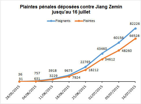(Minghui.org) À ce jour, 82 226 personnes ont déposé 66 528 plaintes pénales contre Jiang Zemin, l'ancien chef du Parti communiste chinois, entre la fin mai et le 16 juillet 2015. Elles exhortent le Parquet populaire suprême et la Cour populaire suprême de traduire Jiang en justice pour ses abus de pouvoir dans l'orchestration de la violente persécution du Falun Gong en Chine.