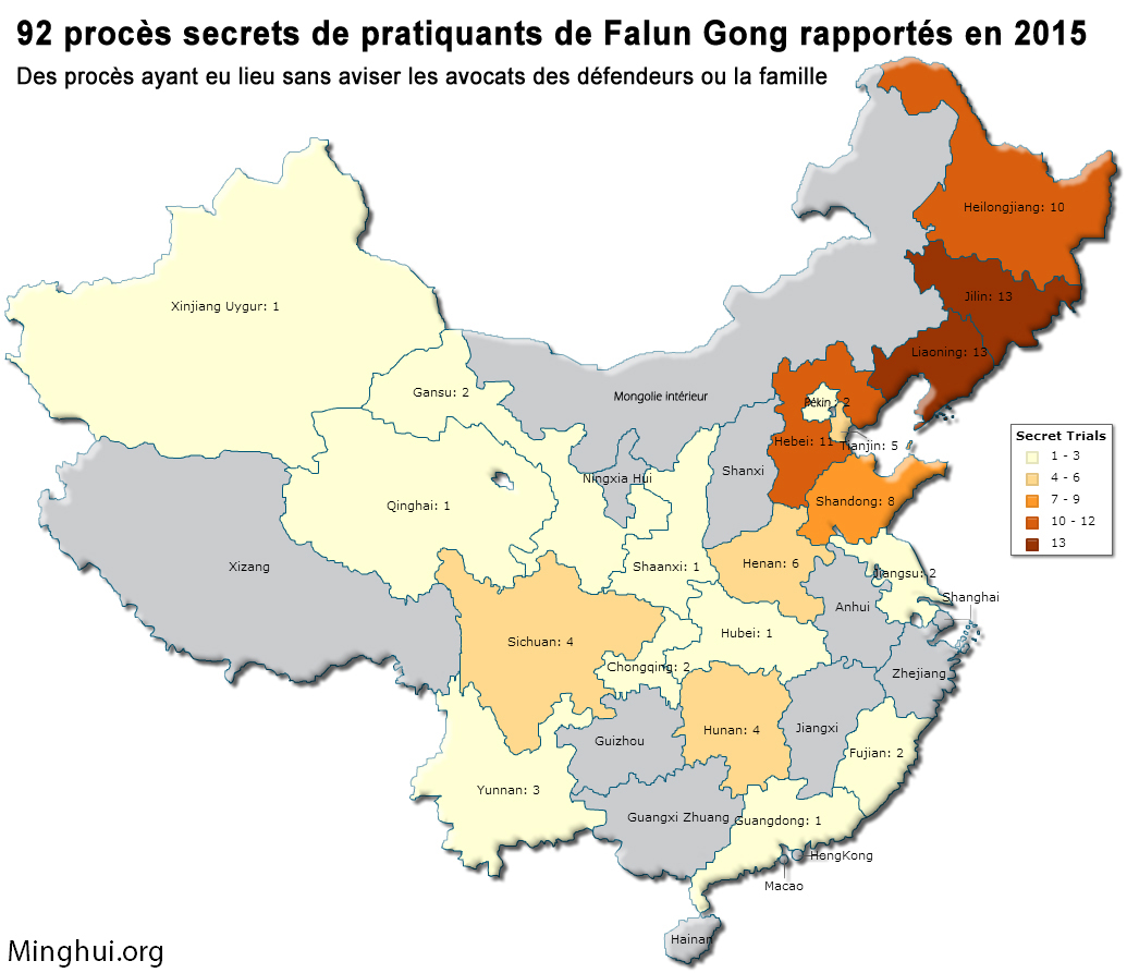 Les affaires judiciaires déclarées en 2015 se composent de pratiquants de 22 provinces, 4 municipalités (Pékin, Tianjin, Shanghai, Chongqing), et 3 régions autonomes (Mongolie intérieure, Ningxia, Xinjiang).