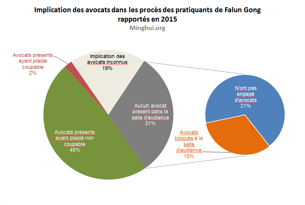 Parmi les 501 cas signalés, il n'y a pas suffisamment d'information concernant la participation de l'avocat pour 95 cas (19%). Les 406 cas restants comprennent des informations indiquant que certains pratiquants de Falun Gong accusés ont utilisé des avocats pour défendre leur droit constitutionnel à la liberté de croyance.