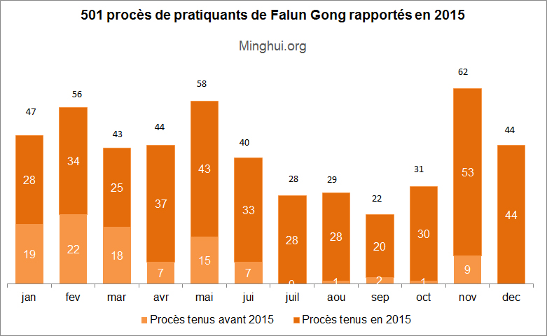 Au cours de 2015, Minghui.org a rapporté 501 nouveaux cas de pratiquants de Falun Gong qui ont été jugés. Parmi eux, 403 cas impliquent des pratiquants qui ont été jugés en 2015, tandis que le reste concerne des audiences de la Cour qui ont eu lieu avant 2015.