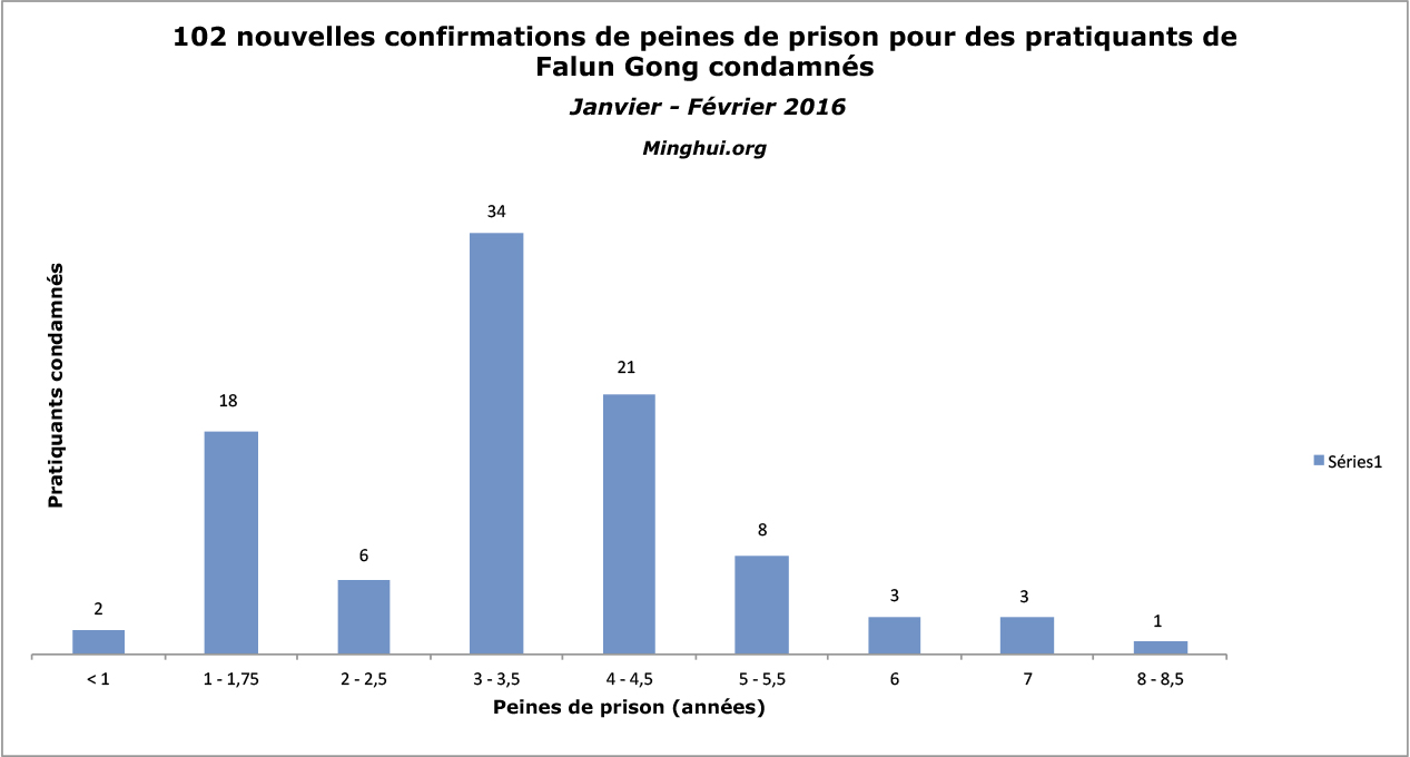 (Minghui.org) Selon les informations recueillies par Minghui.org, 112 nouveaux cas de pratiquants de Falun Gong condamnés à la prison en Chine pour leur foi ont été confirmés au cours des deux premiers mois de 2016. Parmi les 112, 54 ont été condamnés en 2016 et 58 en 2015. Ces cas n’ont pas été signalés en temps opportun du fait de la censure de l'information en Chine.