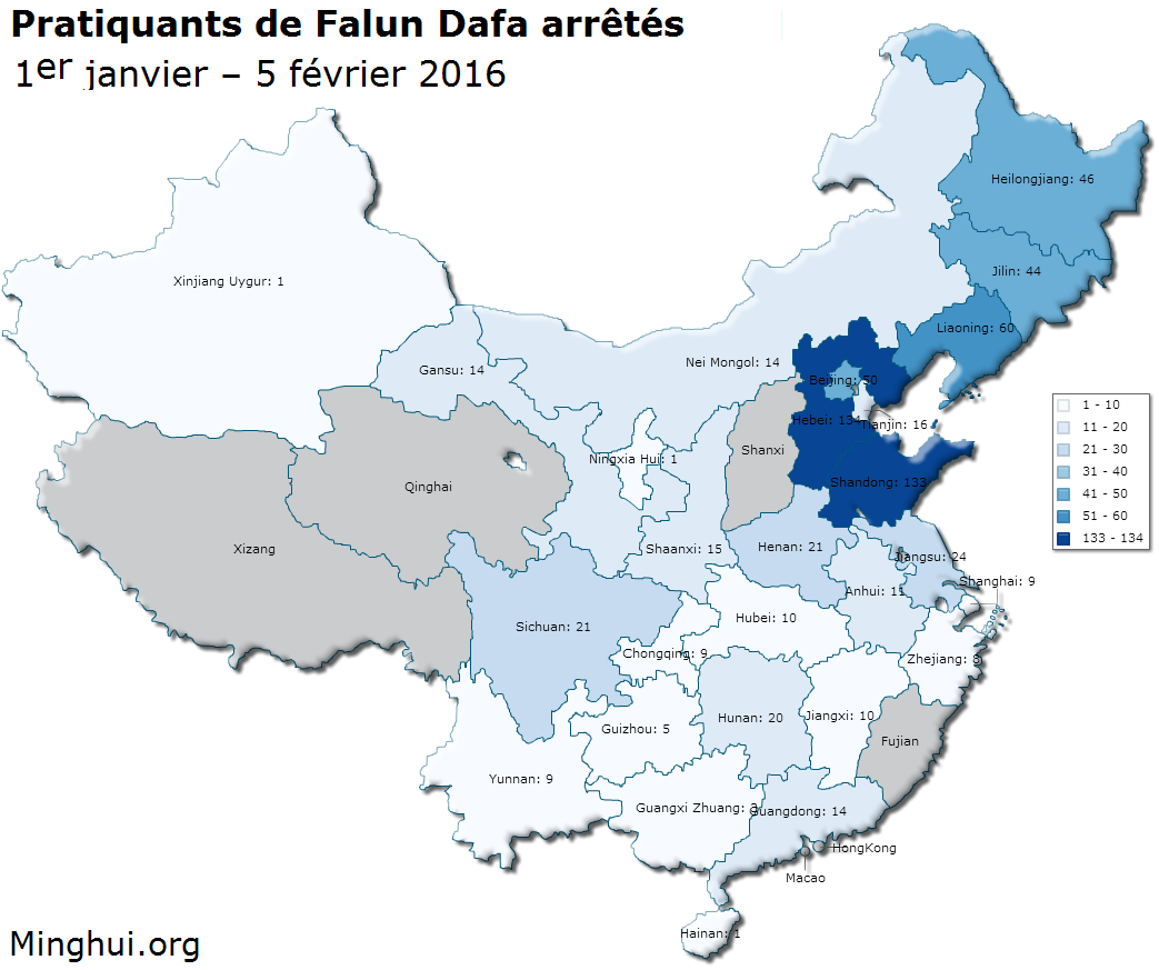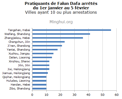 Selon les données rassemblées par le site Minghui, 735 pratiquants ont été arrêtés entre le 1er janvier et le 5 février. 156 d'entre eux ont été placés en détention pour avoir déposé plainte contre l'ancien chef du PCC Jiang Zemin qui a lancé la persécution du Falun Gong.
