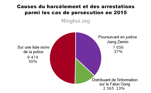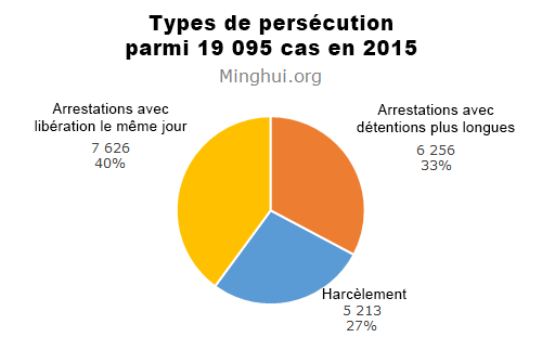 (Minghui.org) Selon les données recueillies par Minghui.org, le régime communiste chinois a continué à persécuter le Falun Gong en 2015, avec au moins 19 095 incidents de pratiquants harcelés, arrêtés ou détenus pour leur croyance spirituelle. Beaucoup de pratiquants ont été ciblés plus d'une fois au cours de la dernière année.