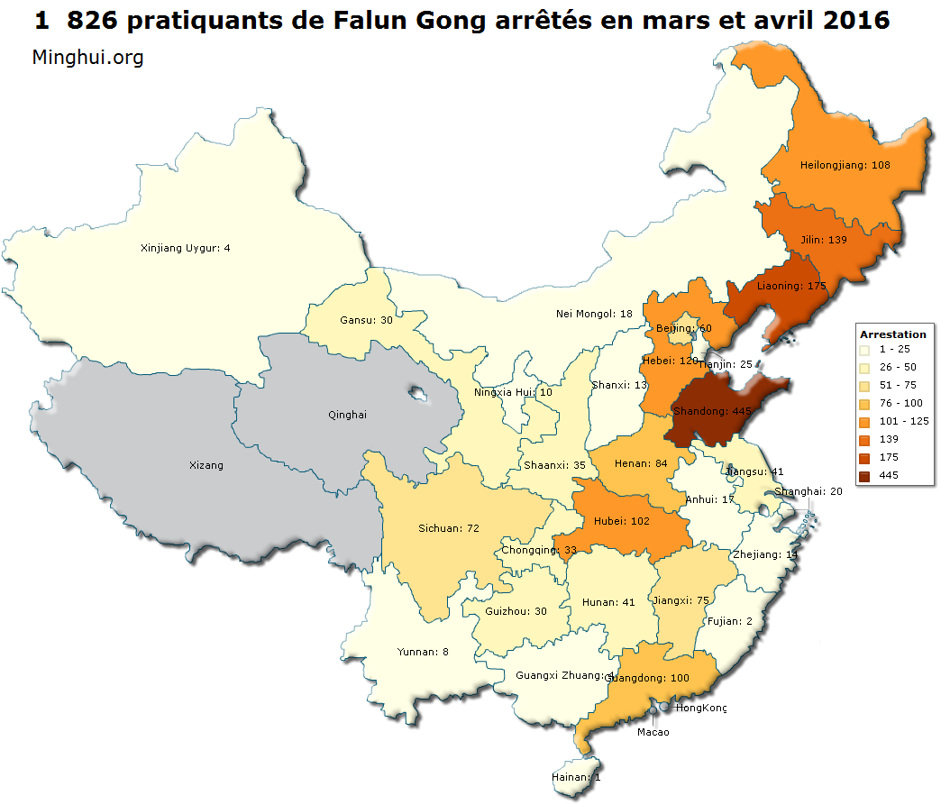 (Minghui.org) Selon les informations compilées par Minghui.org, 1 826 citoyens ont été arrêtés en Chine en mars et avril 2016 pour avoir refusé de renoncer au Falun Gong, une discipline spirituelle persécutée par le régime communiste chinois.