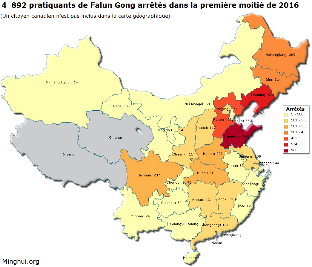 (Minghui.org) Selon les informations recueillies par Minghui.org, 4 892 personnes ont été arrêtées en Chine dans la première moitié de 2016 par le régime communiste sous la persécution du Falun Gong, une discipline spirituelle fondée sur le principe Authenticité-Bienveillance-Tolérance.