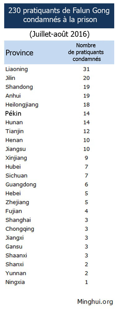 (Minghui.org) Selon des informations compilées par Minghui.org, 230 pratiquants de Falun Gong ont été condamnés à la prison par le système pénal du Parti communiste chinois (PCC) entre juillet et août 2016.