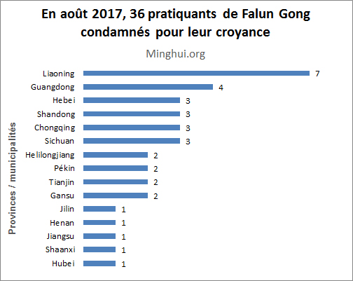 De plus, encore 33 condamnations qui ont eu lieu entre mars et juillet 2017 ont été confirmées en août. À cause du blocage de l'information en Chine, on ne peut pas toujours rapporter en temps et en heure le nombre de pratiquants qui ont été condamnés et la durée exacte de leur peine, les informations ne sont pas toujours facilement disponible.