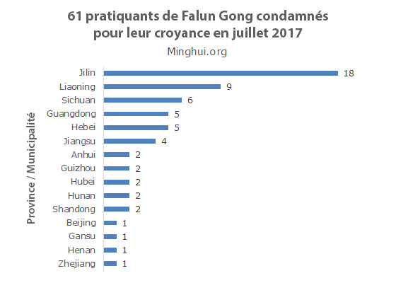 Les 61 pratiquants proviennent de 15 provinces et municipalités. La province du Jilin est en tête avec 18 condamnations, suivie par les provinces du Liaoning et du Sichuan avec respectivement 9 et 6 condamnations chacune.