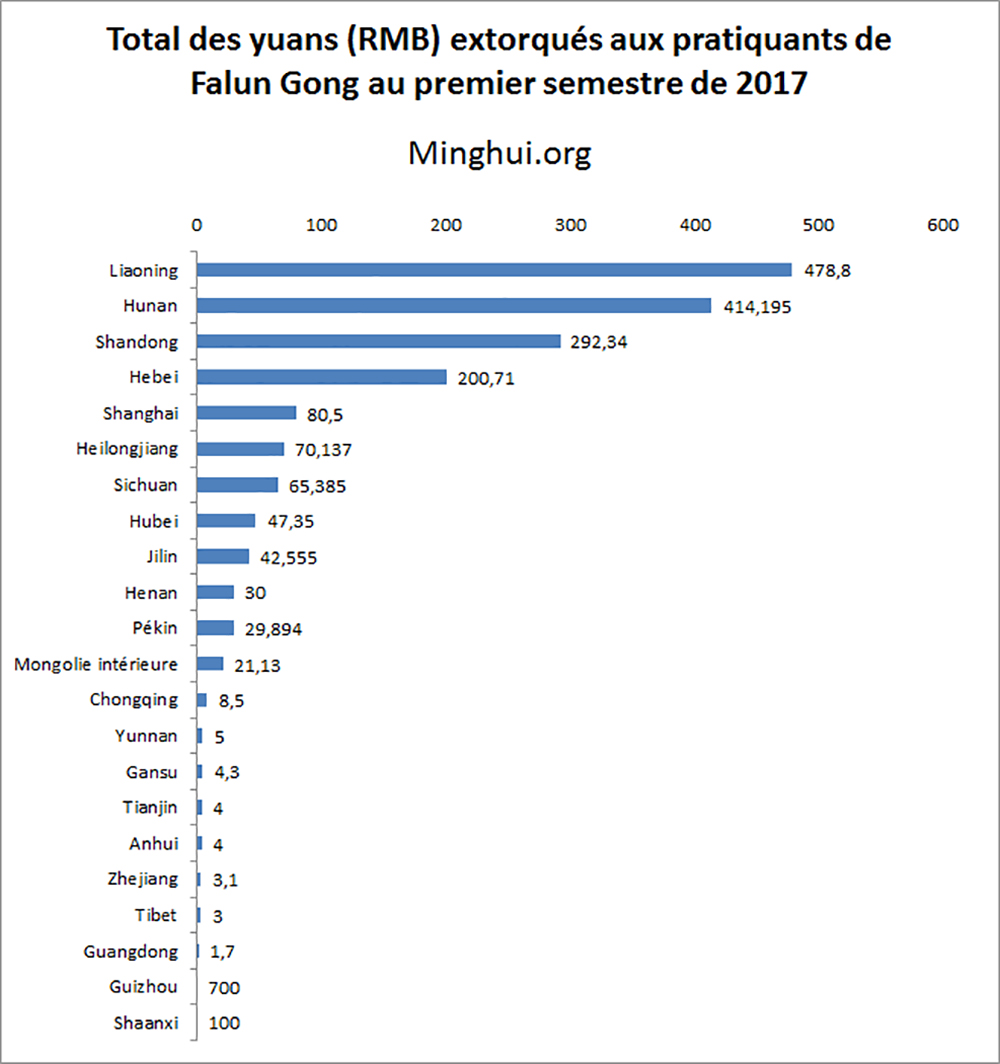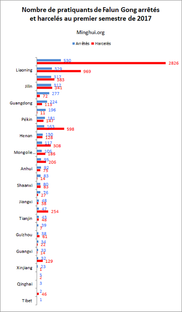 (Minghui.org) Encore 4278 cas de pratiquants de Falun Gong arrêtés ou harcelés ont été signalés en juin 2017, portant le total à 10 869 au premier semestre 2017. Parmi les pratiquants visés, 3660 ont été arrêtés et 7209 ont été harcelés.