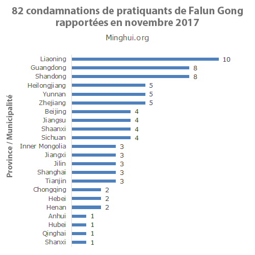En tant que principal centre d’information pour les rapports de persécution contre le Falun Gong, Minghui.org enregistre chaque mois des informations concernant les condamnations illégales de pratiquants. En novembre 2017, Minghui.org a confirmé un total de 82 condamnations illégales de pratiquants, y compris 30 cas qui ont eu lieu entre mars et octobre et 52 cas en novembre. La peine moyenne de prison était de 2,7 ans.