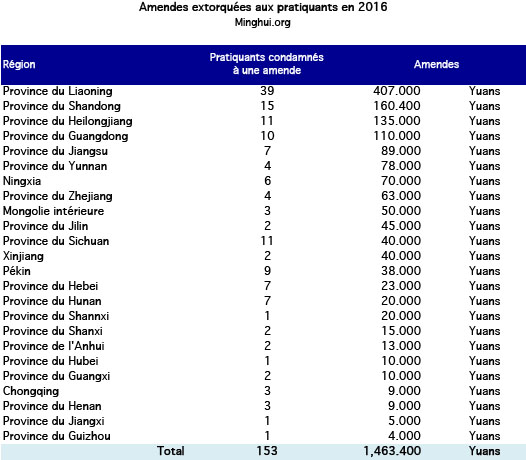 Outre les peines d'emprisonnement, le système judiciaire a également extorqué une somme exorbitante, sous forme d'amendes, à 153 pratiquants dans la mise en œuvre de la directive de Jiang Zemin contre le Falun Gong pour « ruiner leur réputation, couper leurs ressources financières et les détruire physiquement. » Les amendes se sont élevées à 1 463 400 yuans en 2016, pour une moyenne de 9565 yuans par pratiquant.